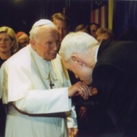 Gen McCaffrey ONDCP Director greets Pope John Paul II in St Louis as part of US Farewell Delegation.